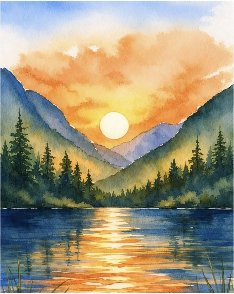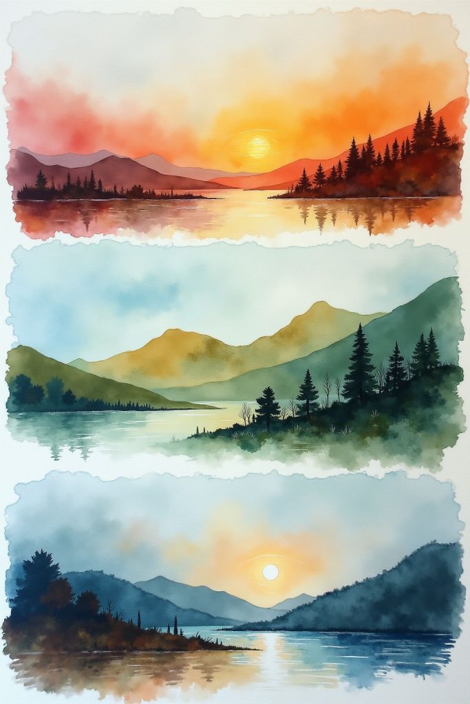 Landscapes painted in watercolor feel dreamy and emotional. Soft skies, distant mountains, and gentle reflections create depth and mood. Light layers help build scenery naturally.