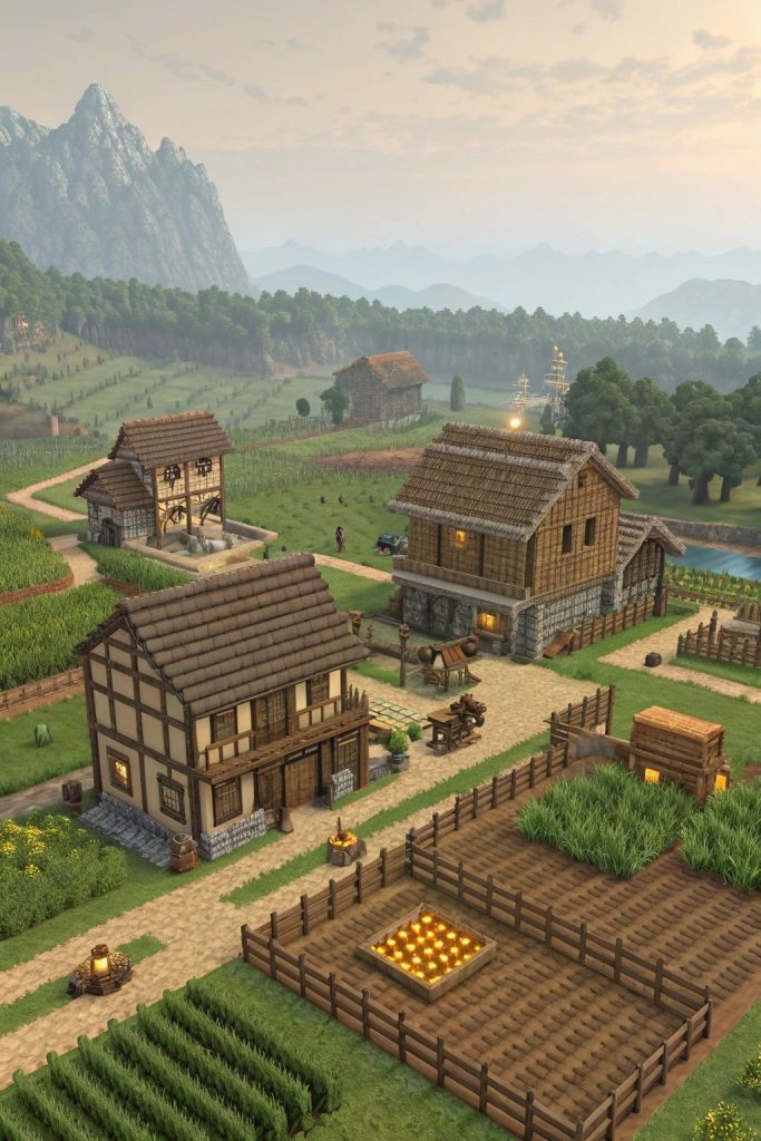 A farmhouse combines living space with farming. It includes crop fields, animal pens, and storage areas. This house is perfect for survival players in the USA who focus on food and long-term gameplay.