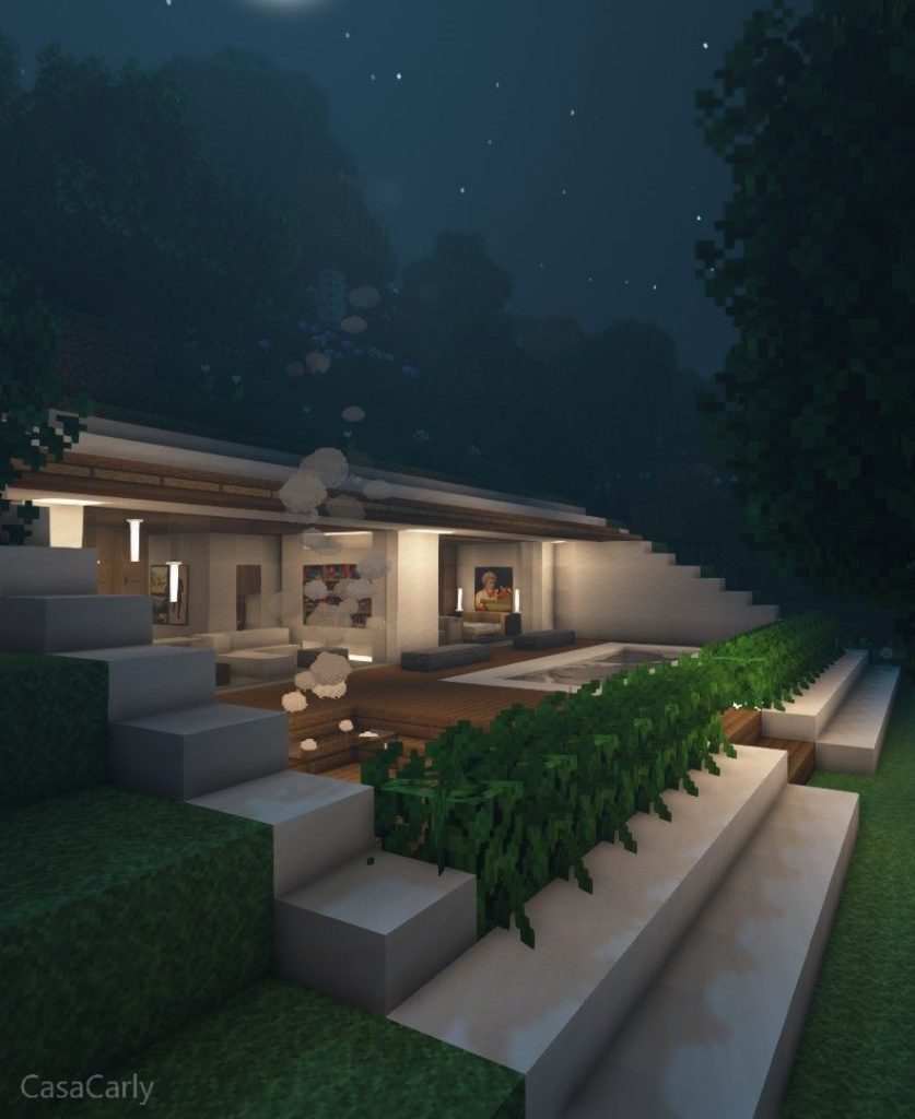 A modern house is one of the most popular Minecraft house styles in the USA. It uses white concrete, glass panes, and clean shapes. Open interiors, large windows, and rooftop designs make it look realistic and stylish.