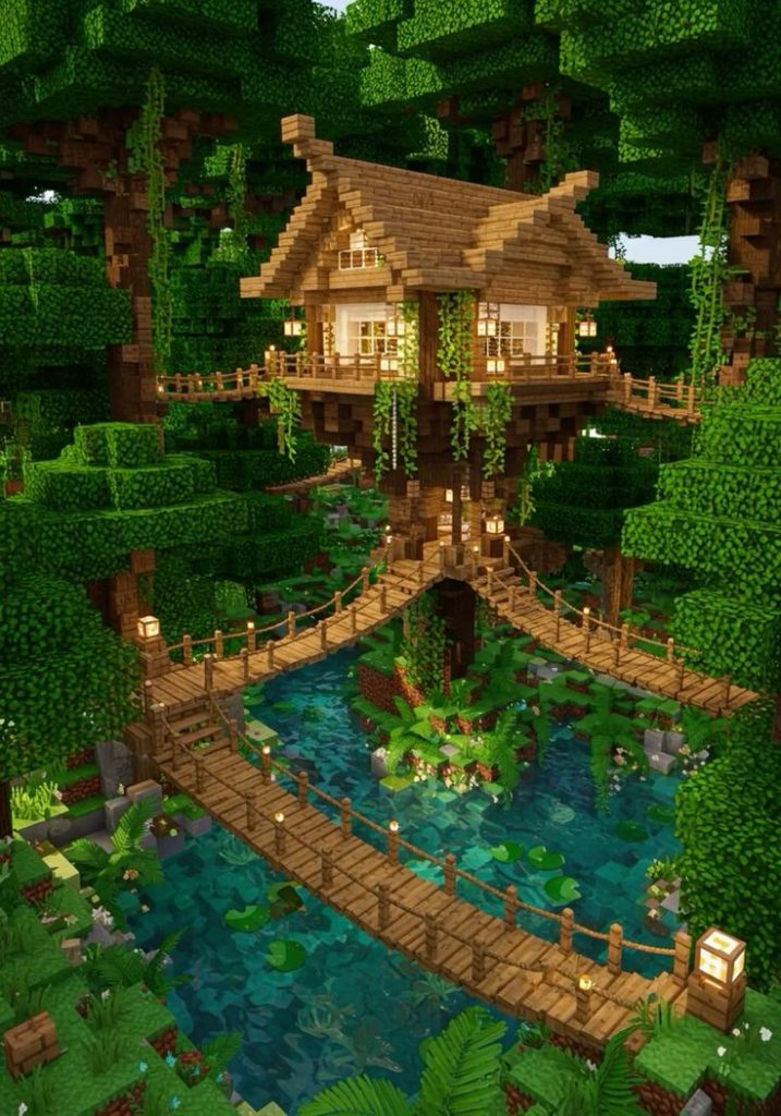 A treehouse is creative and fun. Built high above the ground, it uses wood, leaves, and ladders. This house idea is popular in jungle and forest biomes and loved by USA players who enjoy nature-based builds.